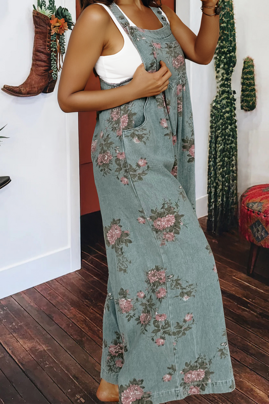 Floral Print Pleated High Waist Wide Leg Denim Jumpsuit