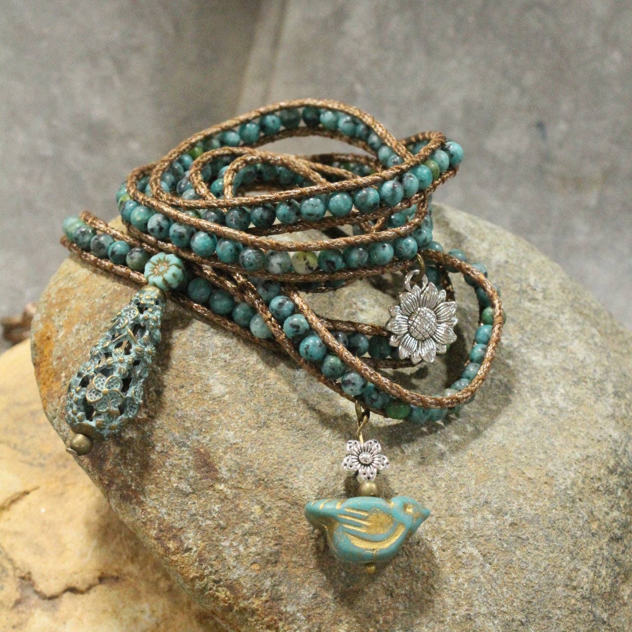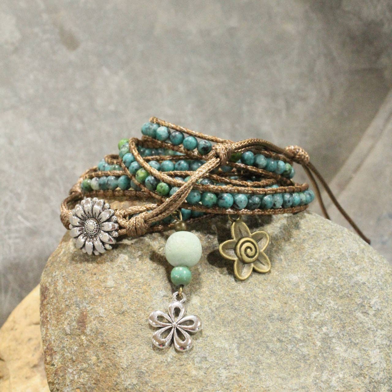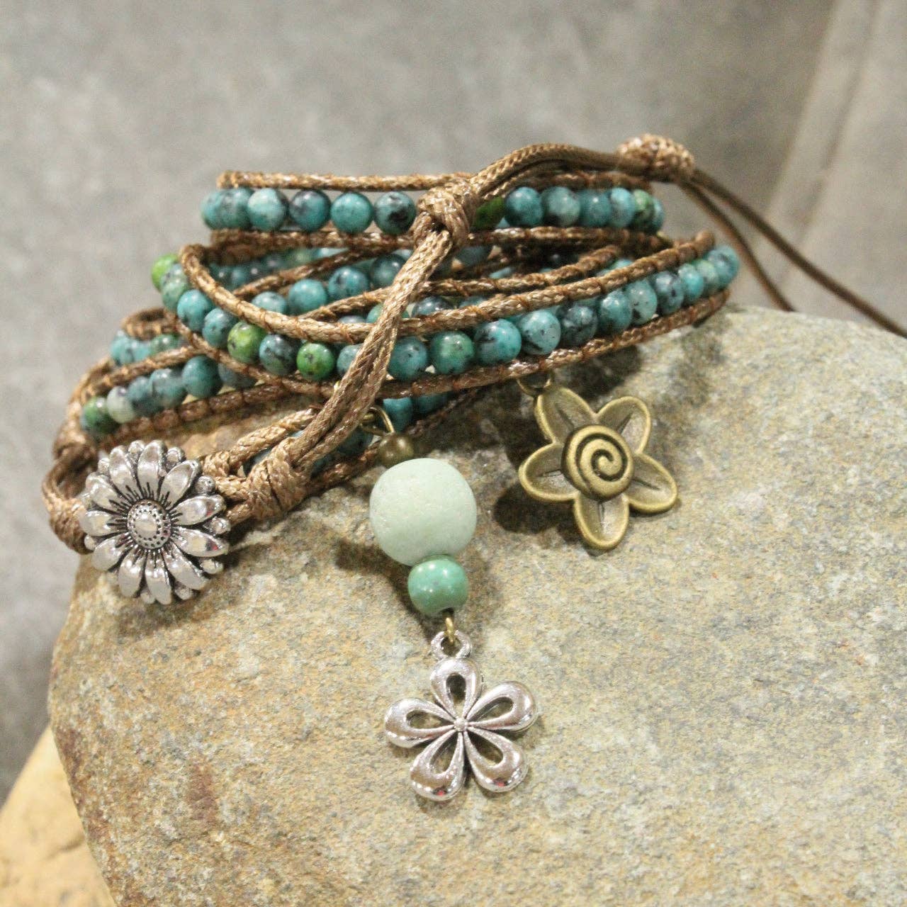 Czech Bird Watching Leather & Stone Flower Wrap Bracelet
