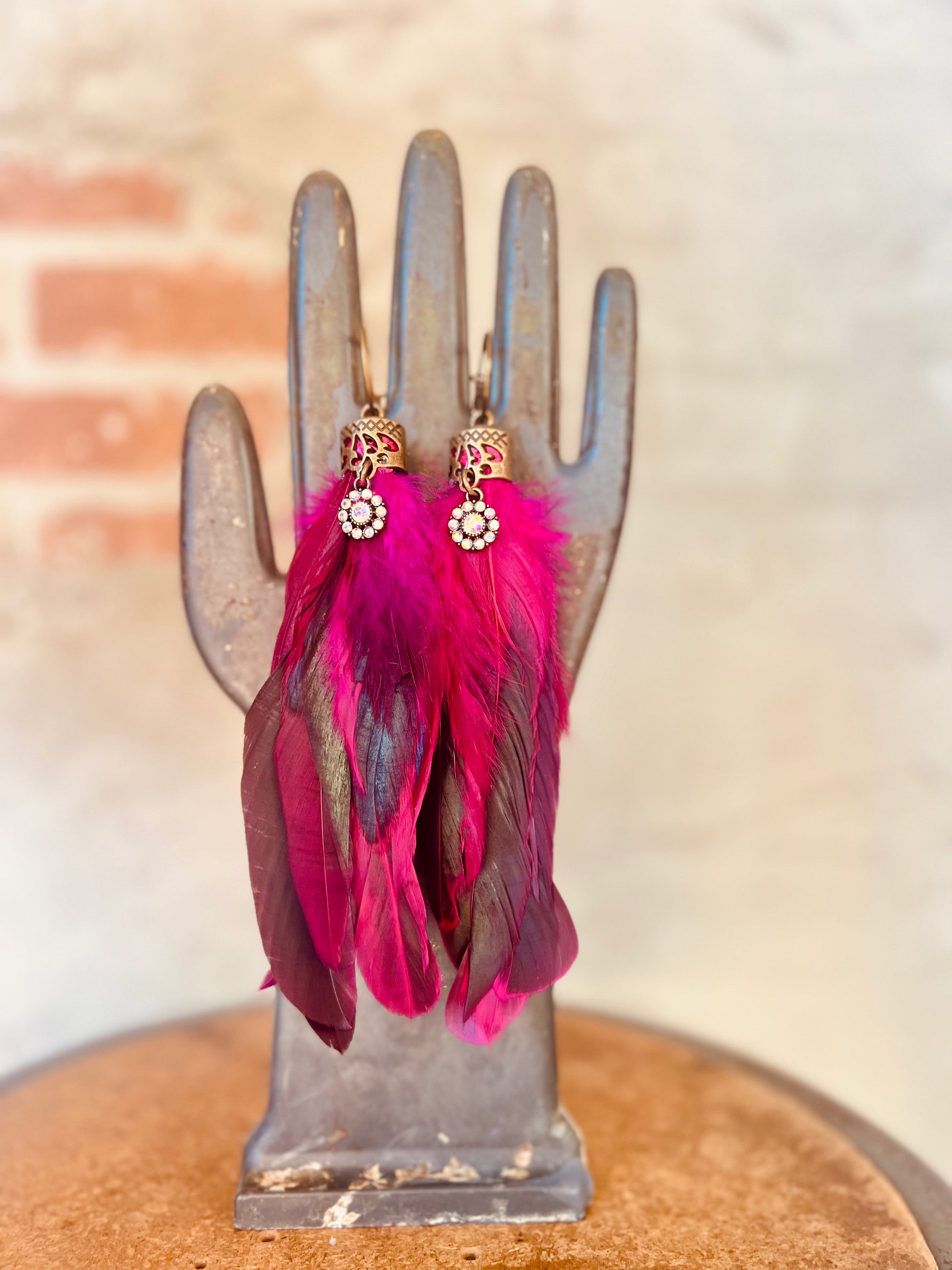 Elevate your style with our stunning Feather Earrings in bold Fuchsia. These earrings add a touch of glamour with a brass decoration and glitzy piece. Measuring 7 inches in length, they make a statement wherever you go. Perfect for any occasion, these earrings are a must-have for any fashion-forward individual.