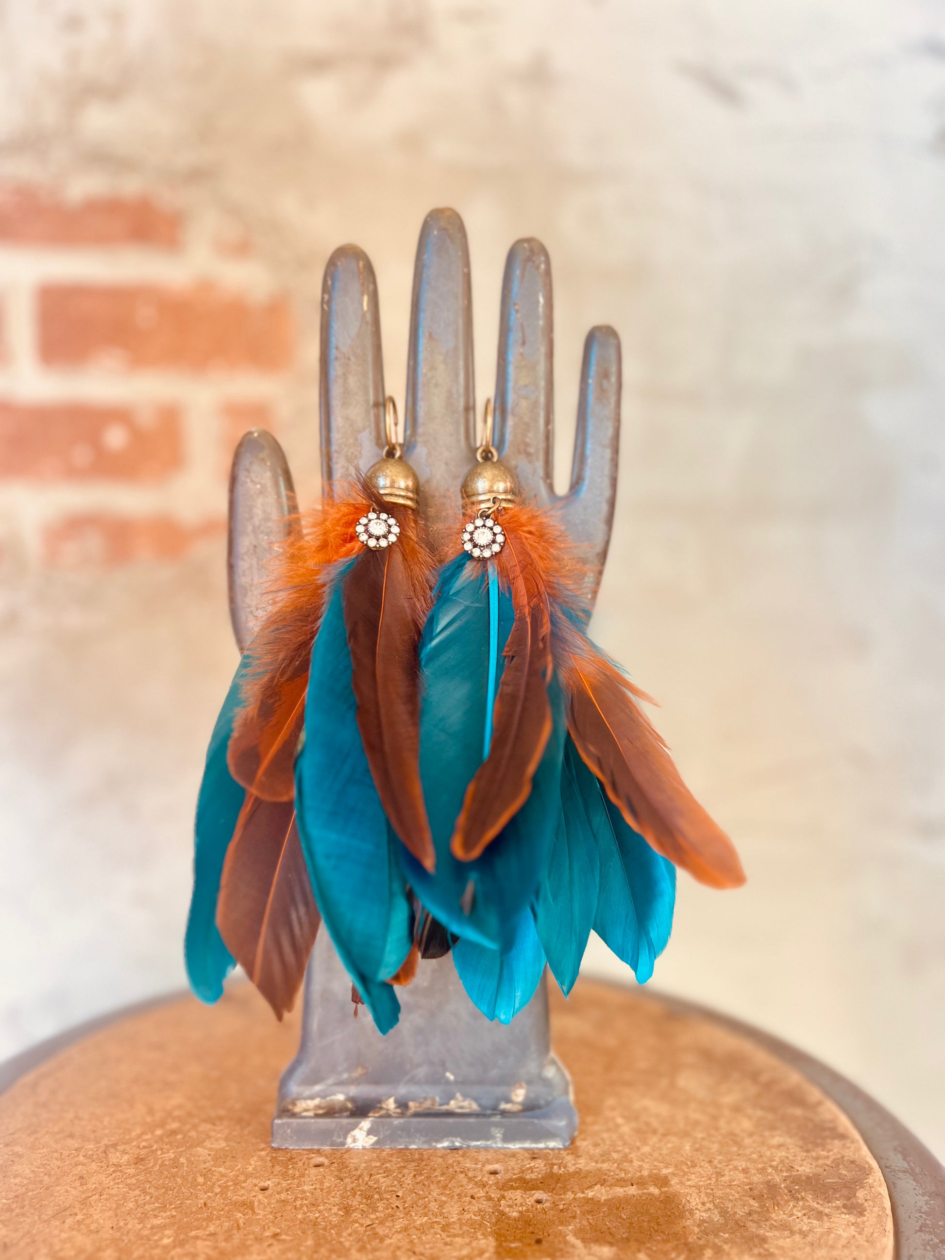 Elevate your style with our stunning Feather Earrings in bold Teal & Brown. These earrings add a touch of glamour with a brass decoration and glitzy piece. Measuring 7-8 inches in length, they make a statement wherever you go. Perfect for any occasion, these earrings are a must-have for any fashion-forward individual.