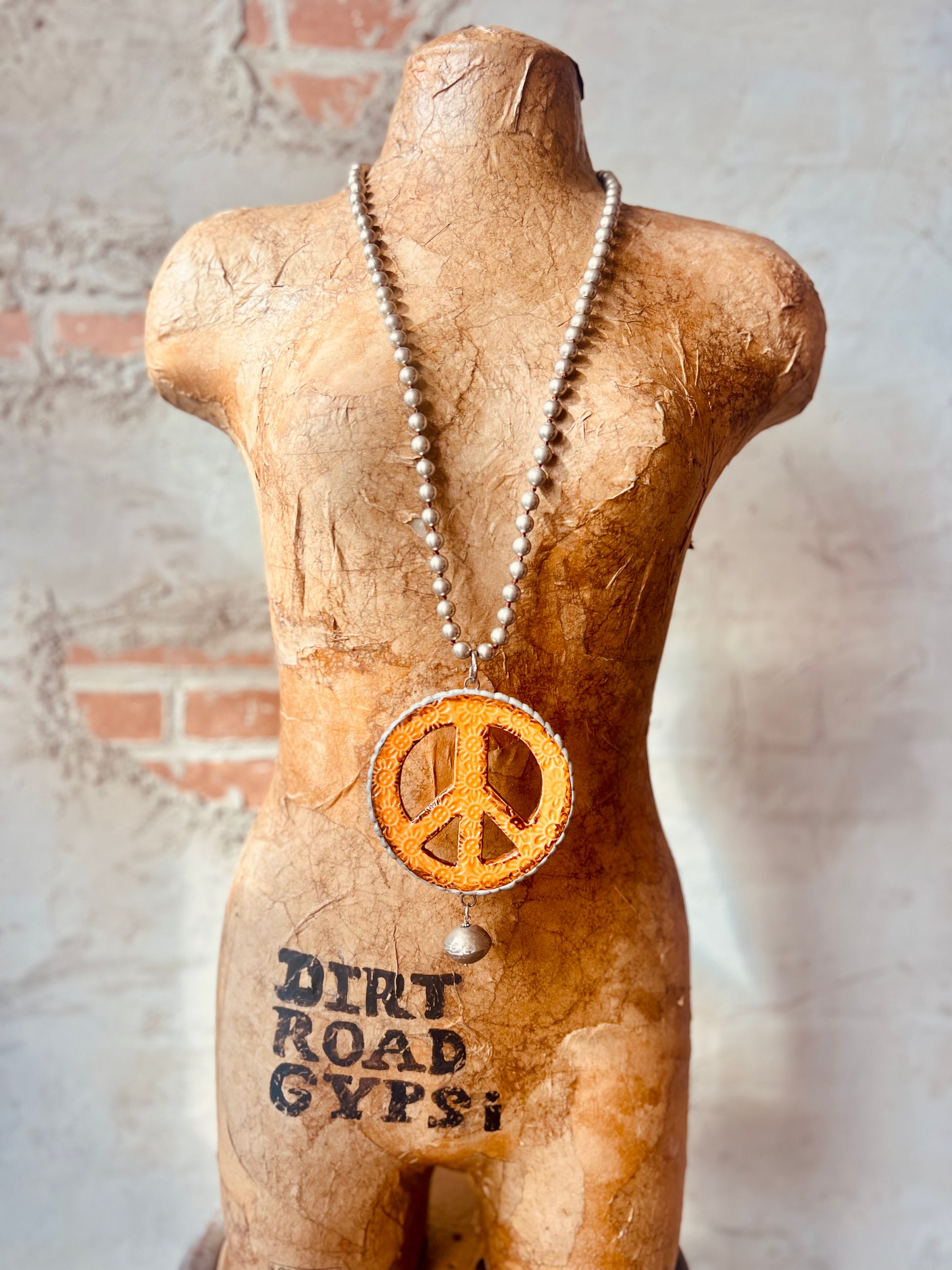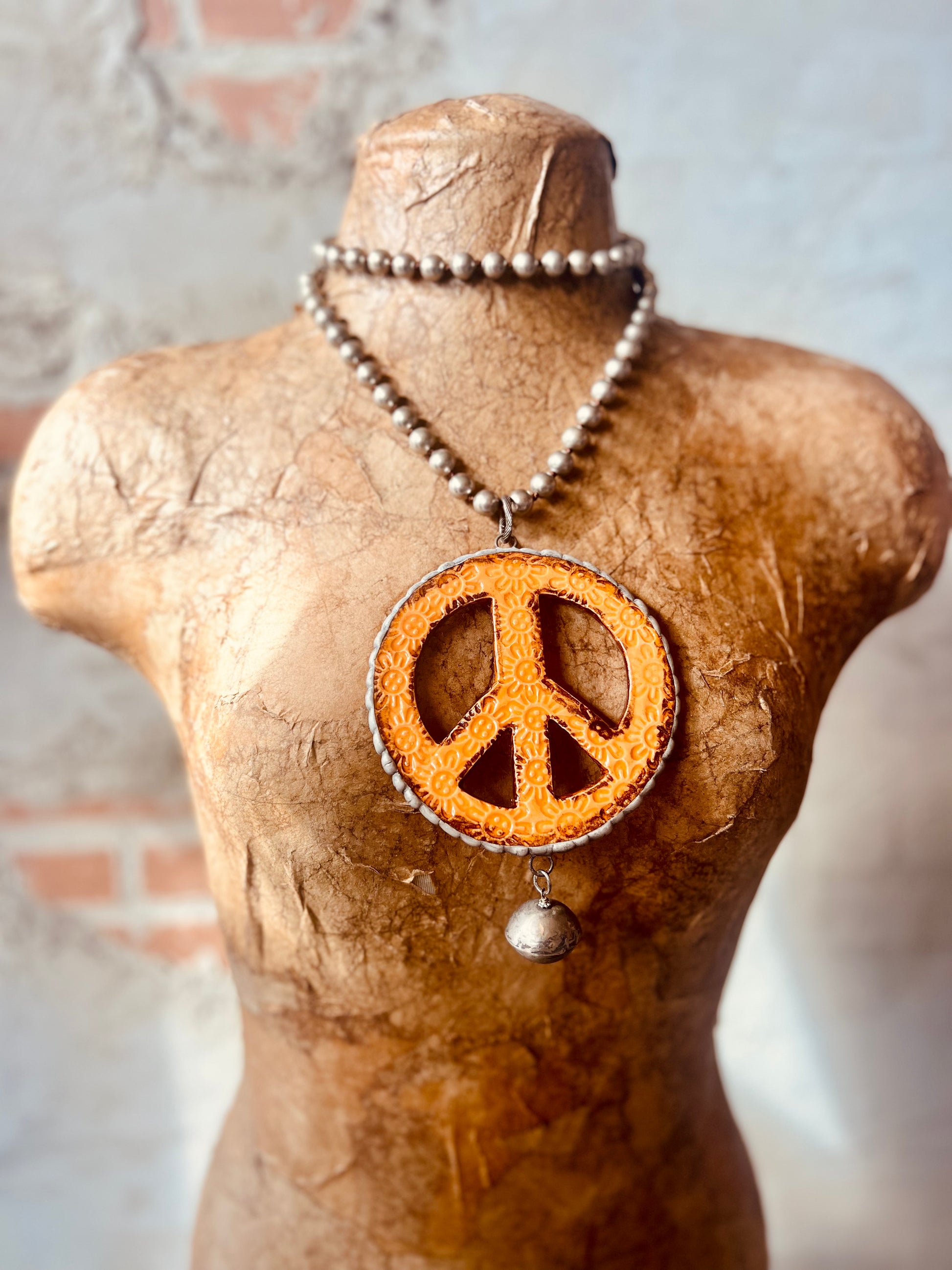 Add quirky style to any outfit with our Floral Peace Pottery Necklace in Orange. Featuring a double strand of faux pearls, a 4.5" peace sign, and a Tibetan silver bead dangling from the bottom, this necklace is the perfect blend of floral and peace. A unique addition to any jewelry collection.