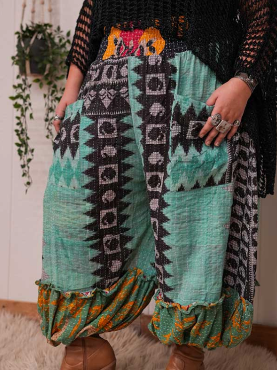 Crafted from our ultra lux kantha stitched vintage cotton sari these pants feature exterior slouchy pockets, a stretchy waistband and an elastic ankle opening. Dress these dream pants up or down to become the ultimate vibe!