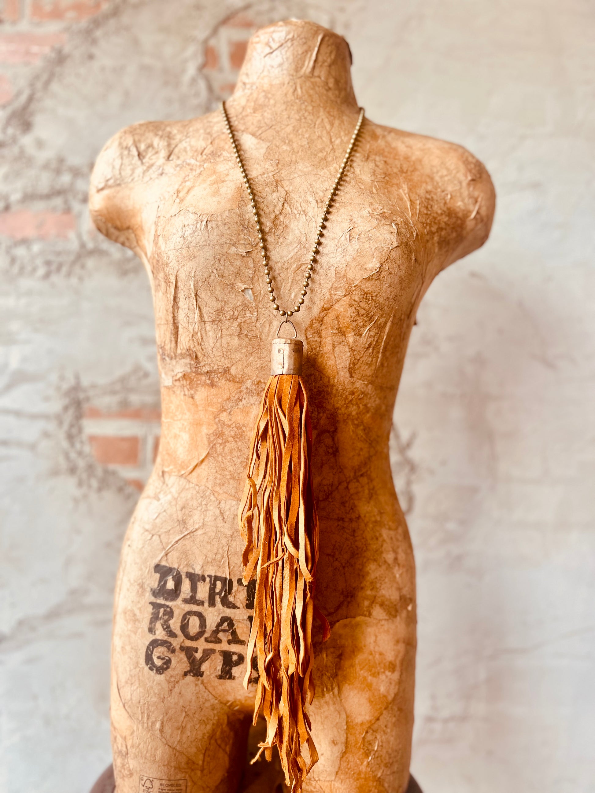 A hand-crafted leather tassel pendant set on a brass ball-chain Necklace. This can be worn by itself, layered with your favorite chains or other leathers. This simple but adorable style is effortless! Made using the softest deer hide leather, this piece is light weight and ready to give any outfit that extra kick of western boho!