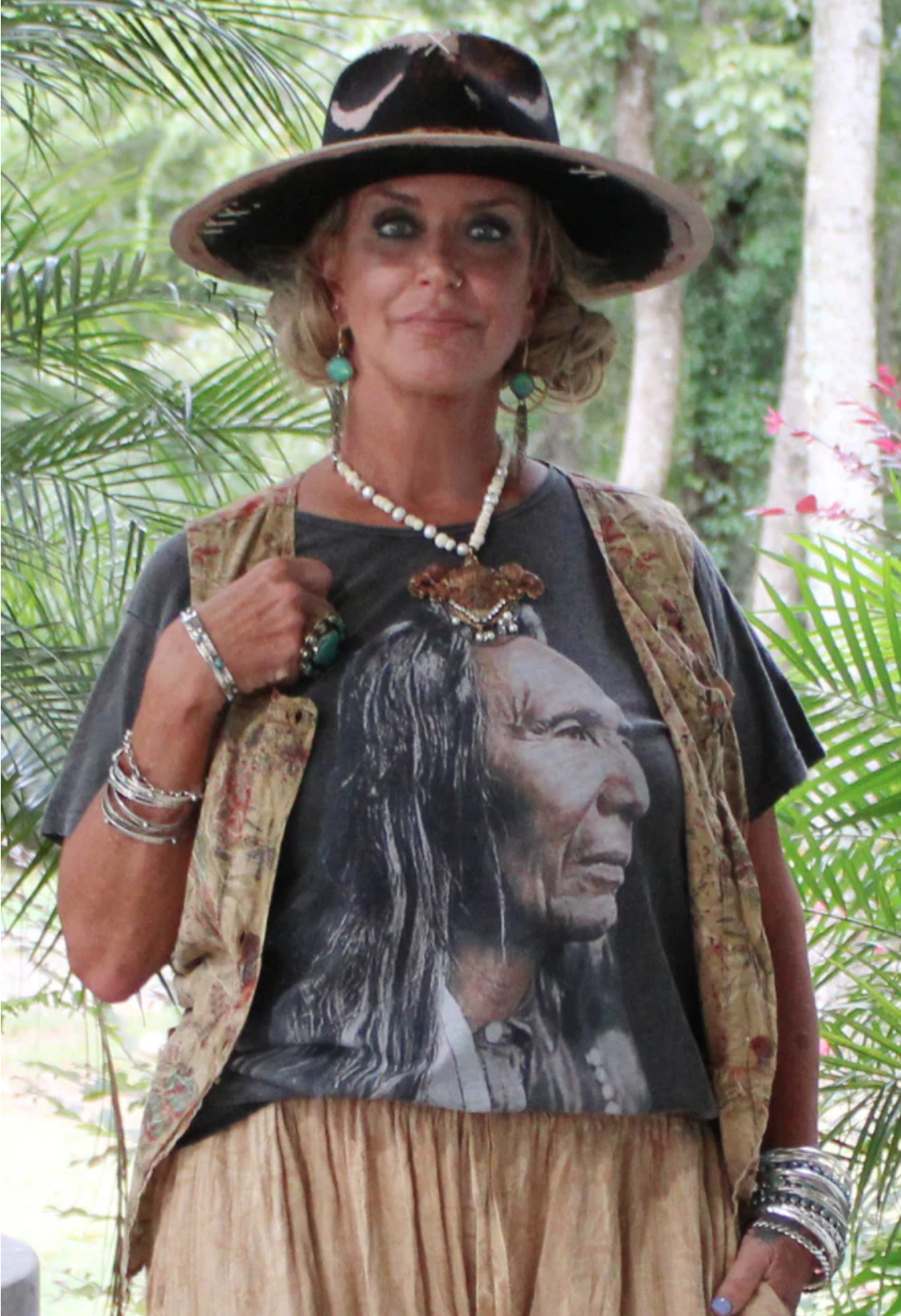 The Moon Dance Tee by Jaded Gypsy offers a stylish fit from Small to 3X with unique distressing on the shoulders for an edgy touch. Featuring stunning graphics, this tee elevates your look effortlessly—feel dressed up while enjoying all the comfort of a classic tee. Perfect for those who want to stand out with subtle detail and bold design.