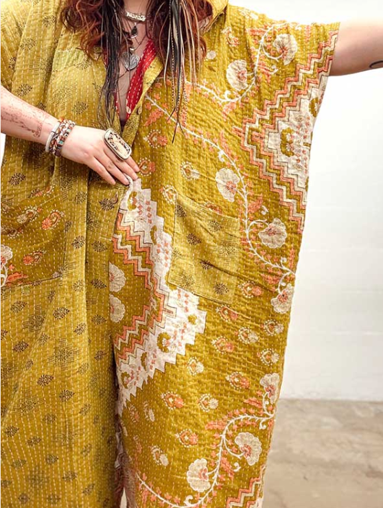 Made from our hand Kantha stitched cotton sari, this one piece wonder features a hood, front button-down closure, pockets, and super flowy pant legs..