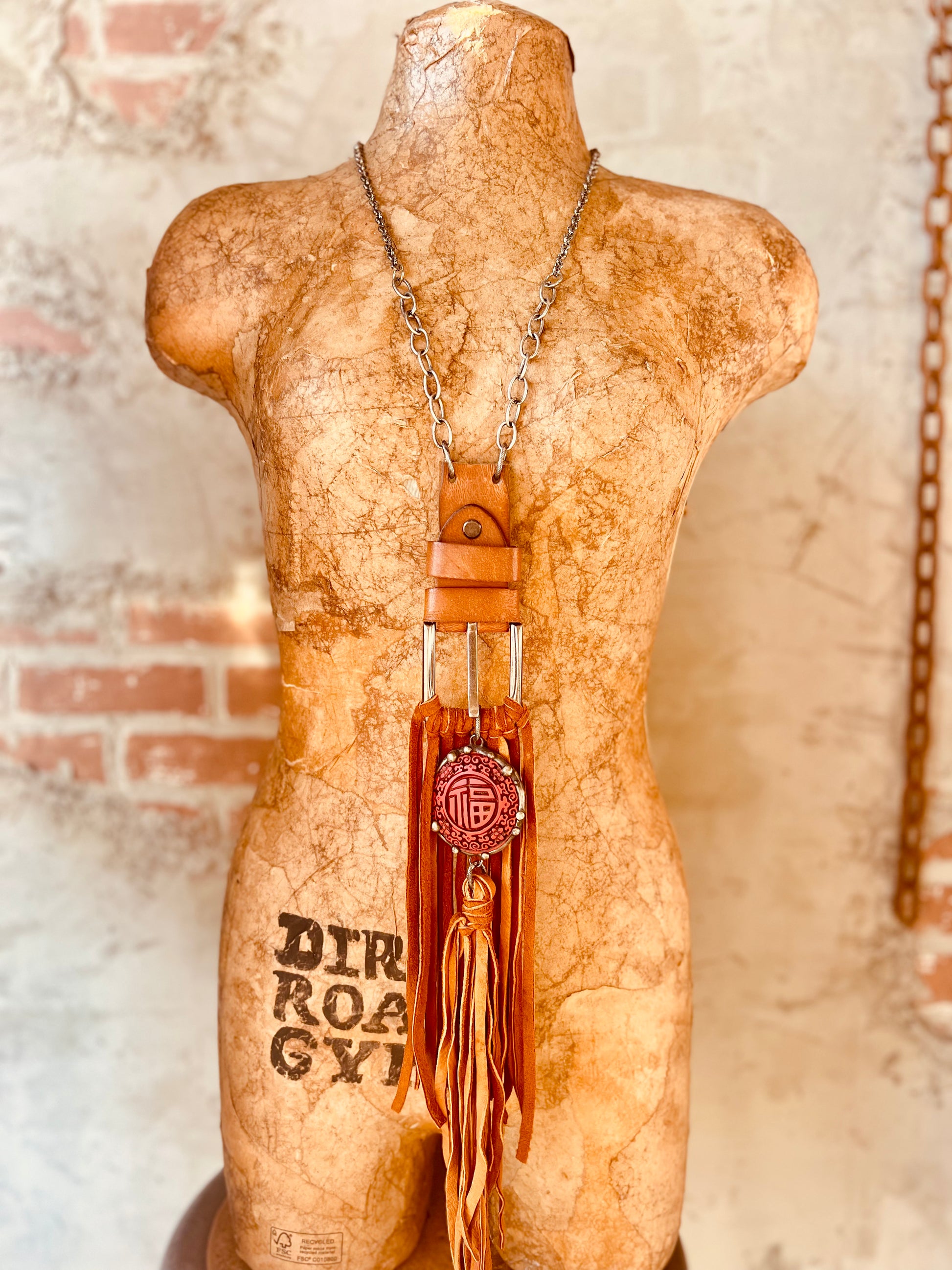 Introducing our Re-Purposed Belt Necklace in Red Maze! This stunning necklace features a re-purposed leather belt, offering a unique and eco-friendly accessory. The soft, worn leather adds a touch of elegance, while the red stone with maze detailing adds a pop of color and texture. Make a statement and feel good about your fashion choices with this one-of-a-kind piece!