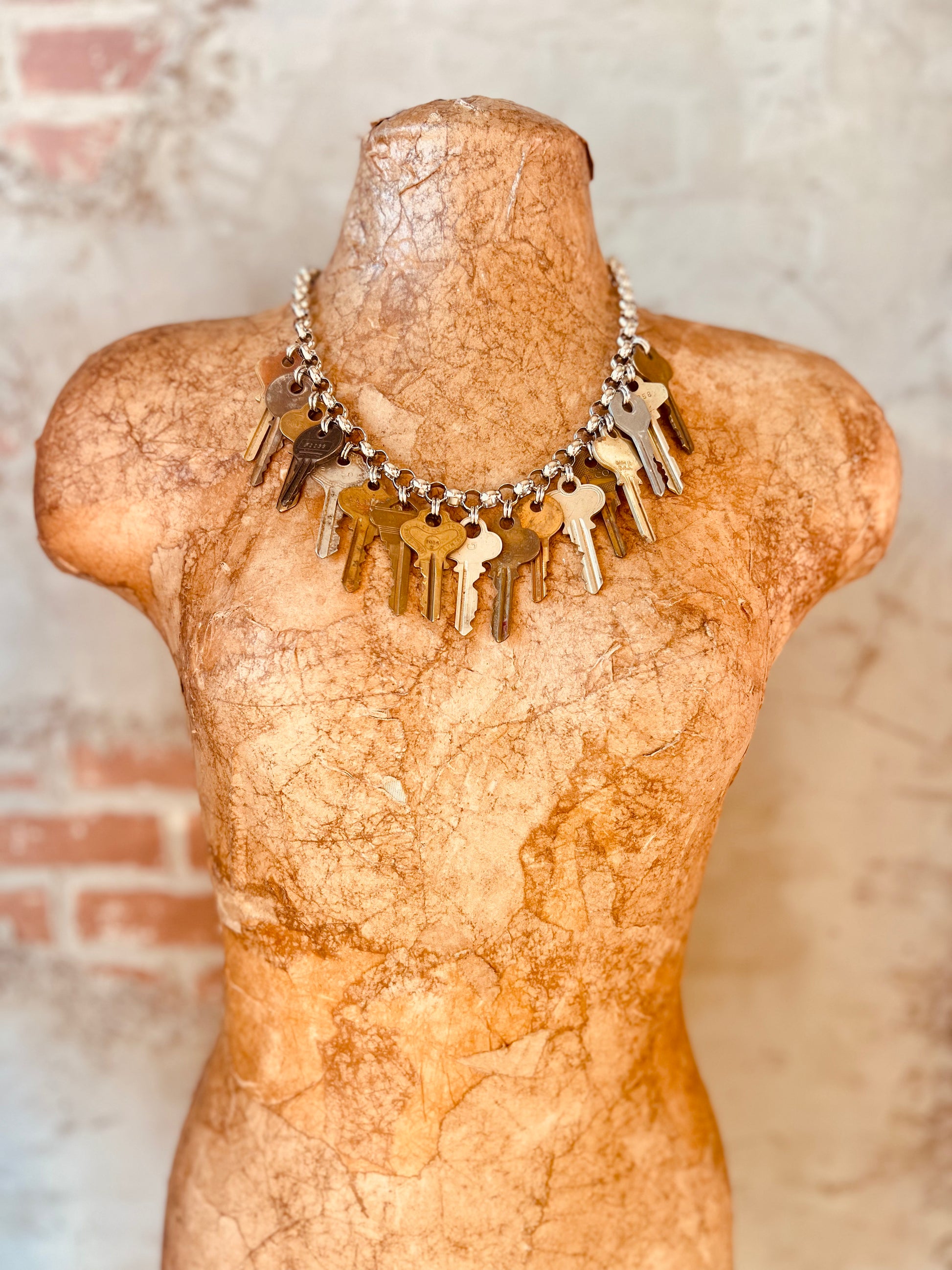 Unlock your fashion potential with The Key To My Heart Necklace! This unique necklace features 18 keys strung across a silver metal chain, adding a whimsical touch to any look. Perfect for the playful and adventurous fashionista in your life.