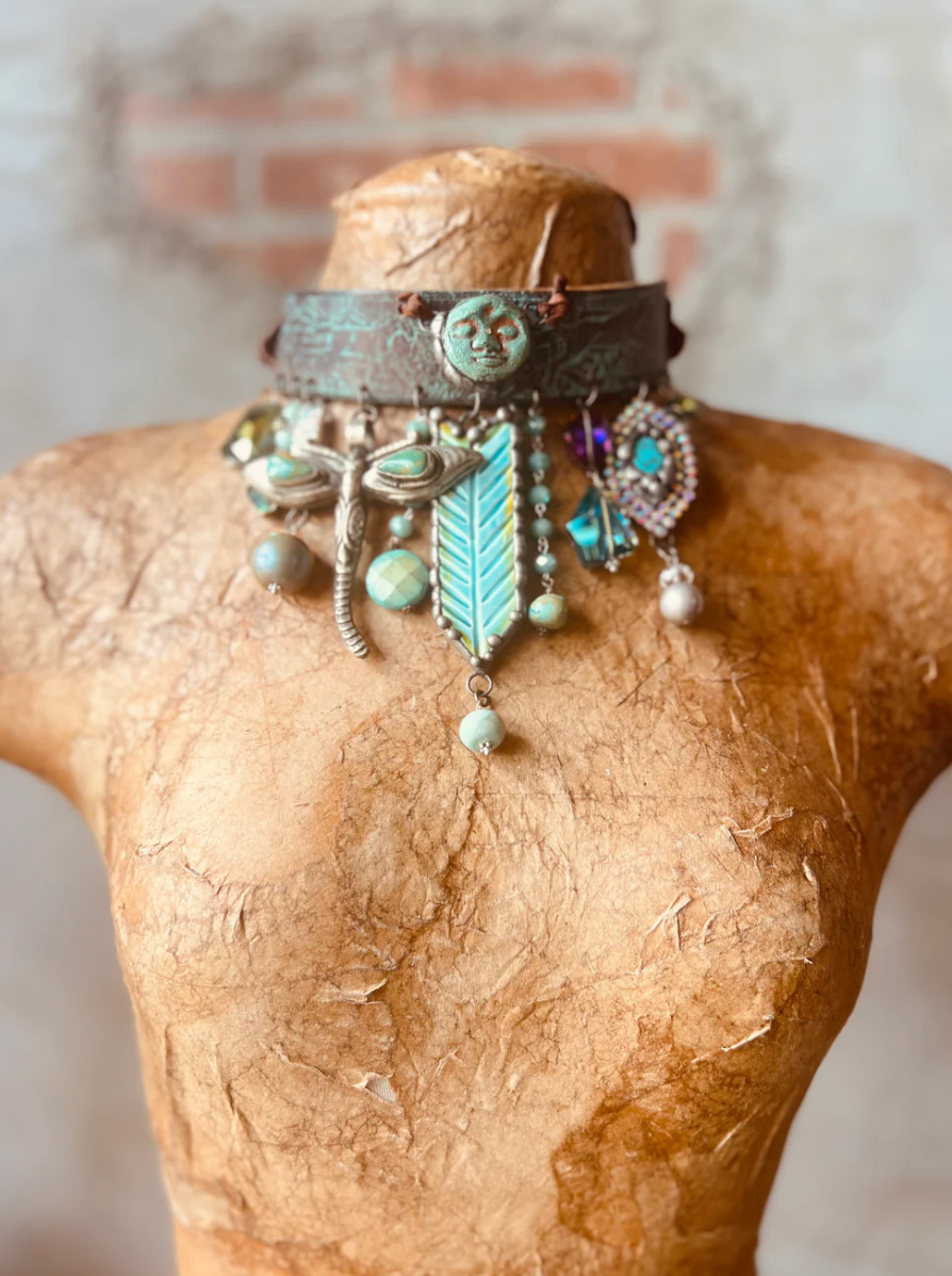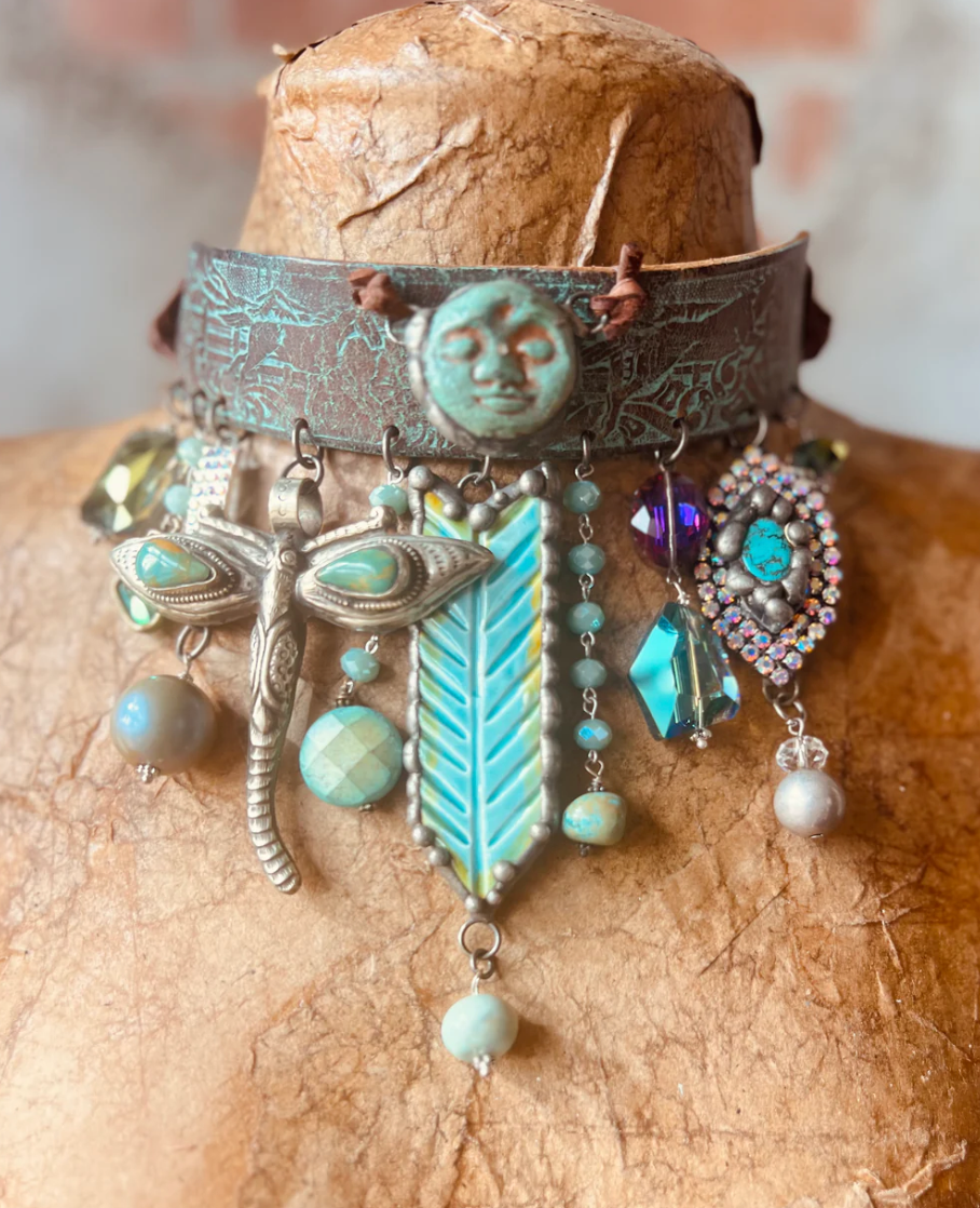 Add some whimsy to your outfit with this handcrafted Turquoise Moon Choker. Featuring Tibetan Silver, Pottery, and Turquoise, as well as charming details like a pottery moon, a Tibetan Silver and Turquoise dragonfly, and a pottery arrow. Perfect for any boho-chic look. (Handmade goodness included)