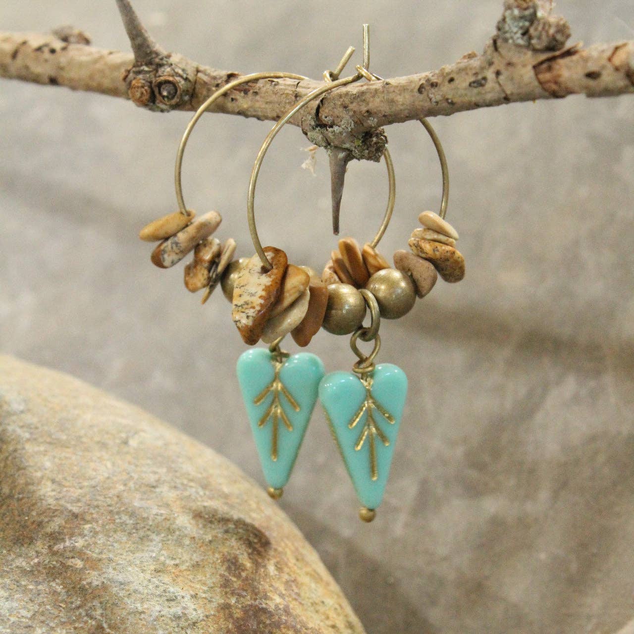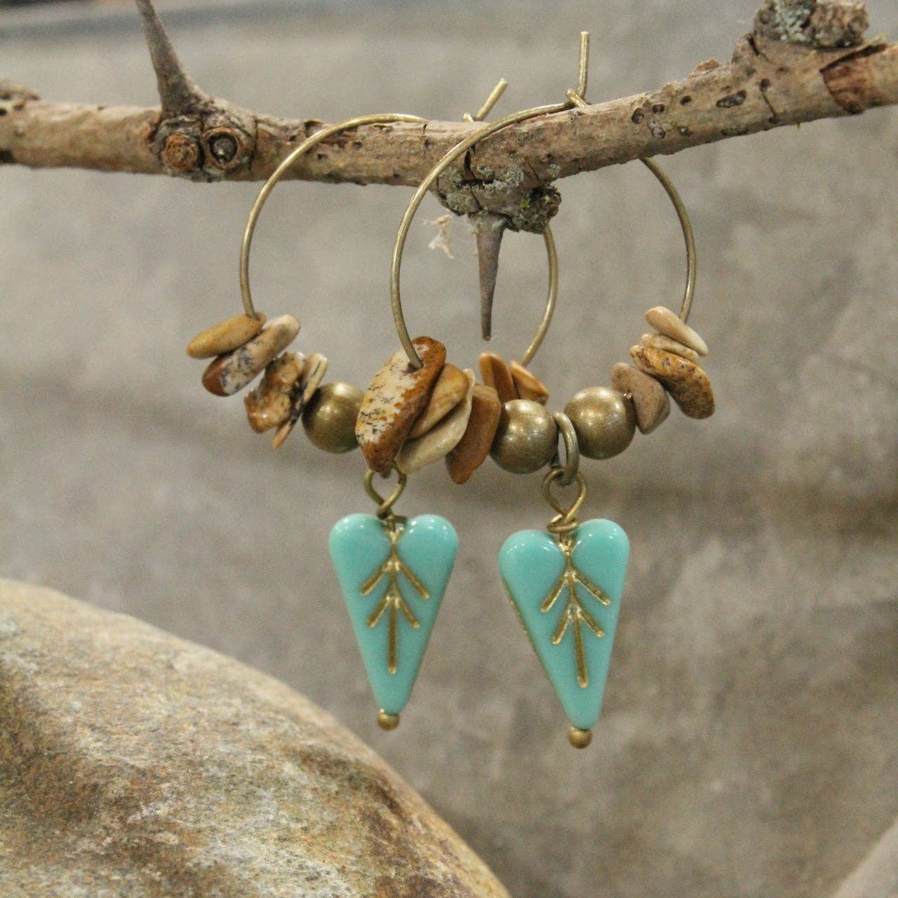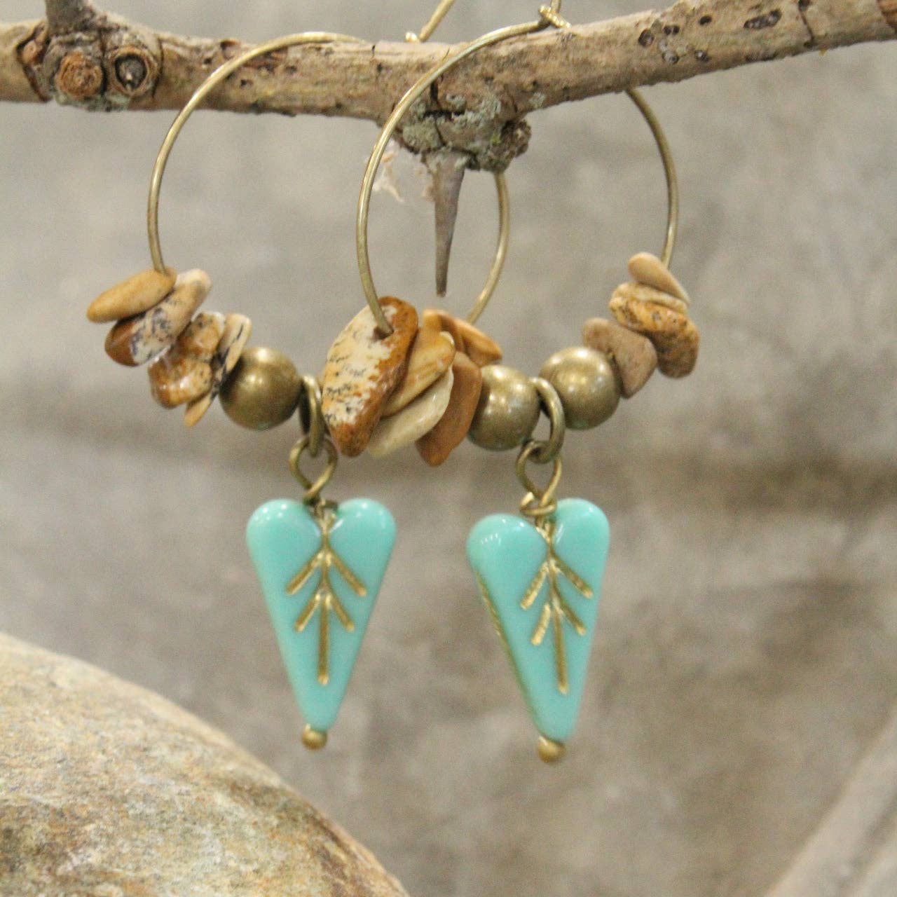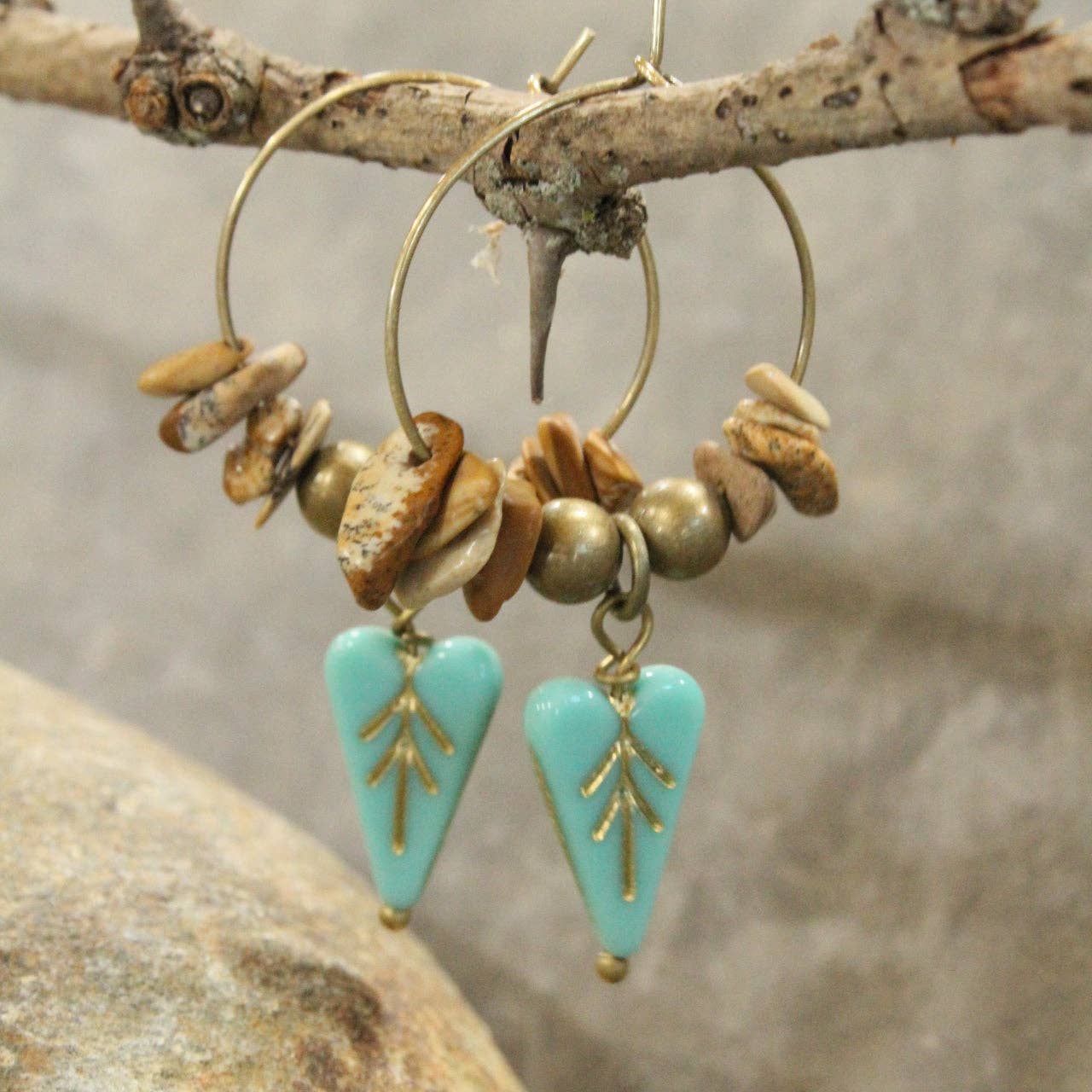 Vintage Czech Heart & Jasper Nugget Drop Earrings
